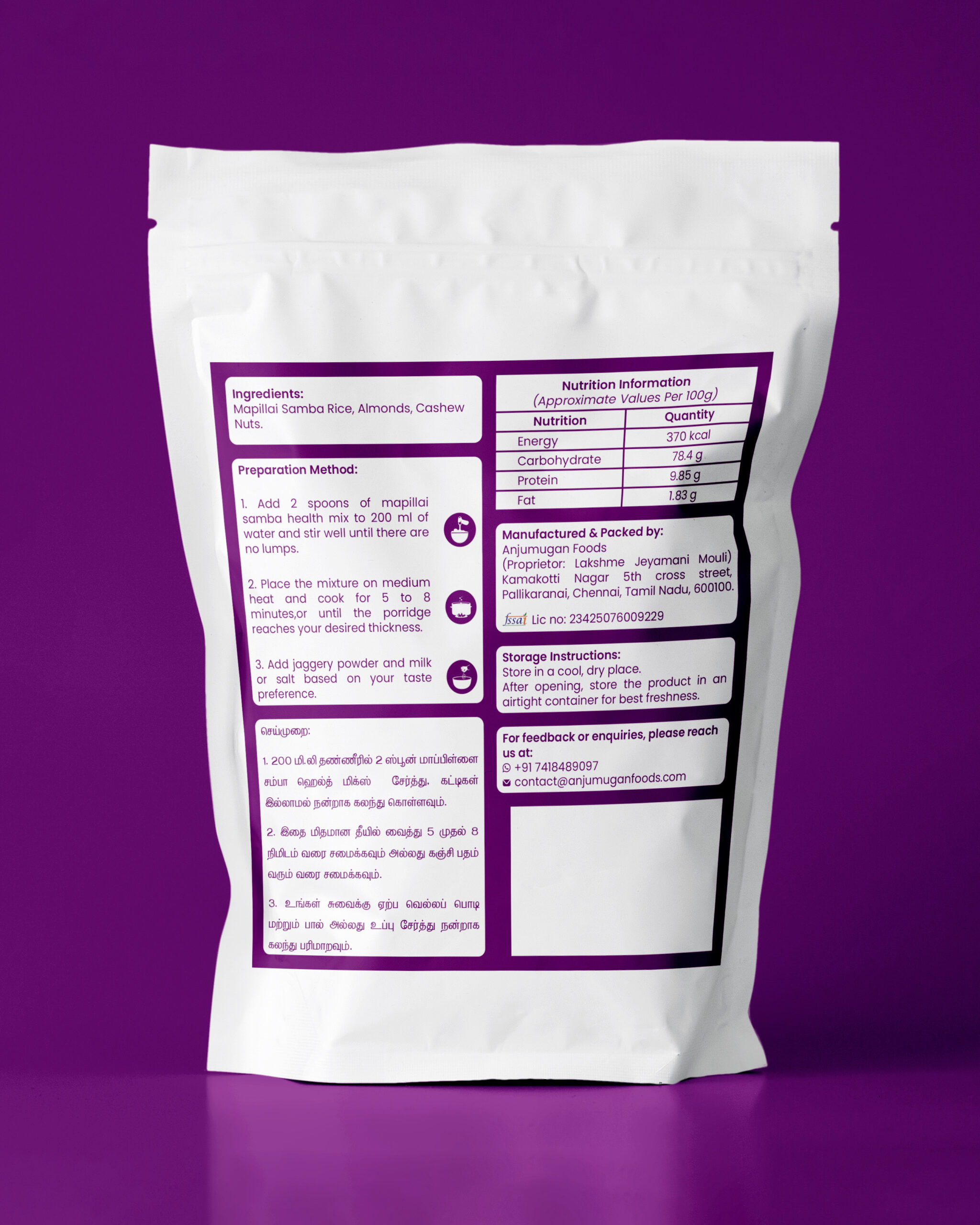 Anjumugan Foods Mapillai Samba Health Mix brings this traditional grain into a convenient, ready-to-use format, blended with almonds and cashew nuts for added richness and nourishment.