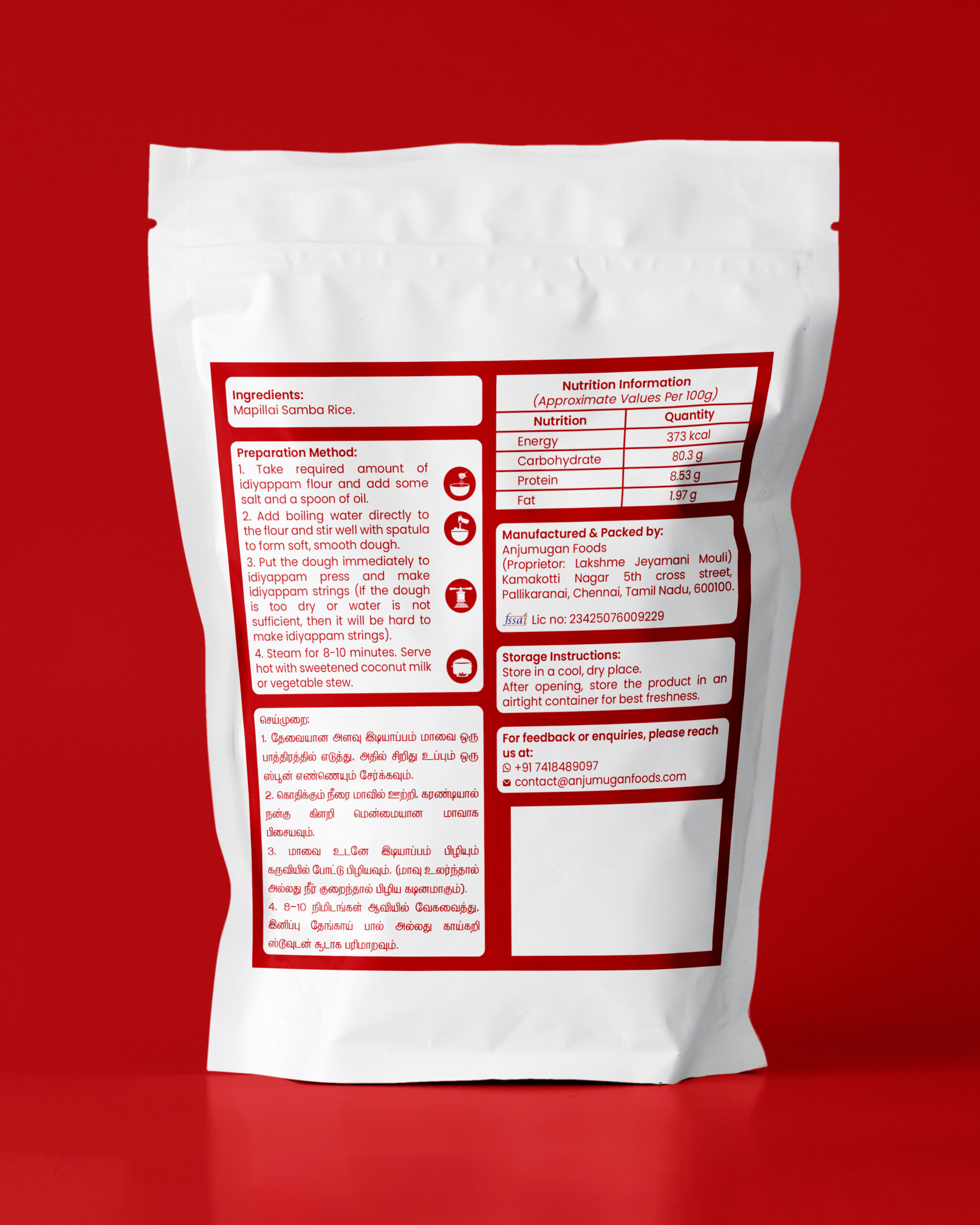 Anjumugan Foods Mapillai Samba Idiyappam Flour is made from carefully selected Mapillai Samba rice, a heritage rice variety valued in Tamil households for generations.